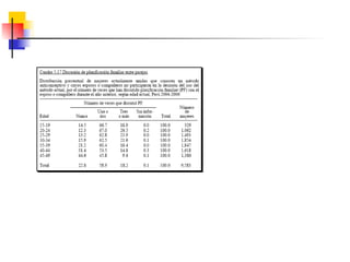 Este documento describe conceptos clave relacionados con la salud sexual y reproductiva, incluyendo fuentes de datos sobre estos temas en el Perú. Explica que la salud sexual y reproductiva se refiere al bienestar físico, mental y social en todos los aspectos de la sexualidad y reproducción, así como el derecho a la información y servicios de salud relacionados. Finalmente, resume algunos problemas actuales en el Perú relacionados con el conocimiento y uso de anticonceptivos, fecundidad deseada vs observada, y acceso a servicios de sal