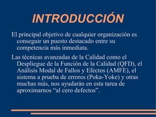 El documento describe varias técnicas avanzadas para la gestión de la calidad, incluyendo el Despliegue de la Función de Calidad (QFD), el Análisis Modal de Fallos y Efectos (AMFE), y los sistemas a prueba de errores (Poka-Yoke). El QFD ayuda a planificar el diseño de productos para satisfacer las necesidades de los clientes. El AMFE identifica posibles fallos, sus causas y efectos, y acciones para prevenirlos. Poka-Yoke busca hacer imposible que se cometan erro