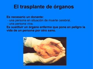 El documento describe los trasplantes de órganos, requiriendo un donante vivo o en muerte cerebral. También cubre las células madre, incluyendo sus tipos (totipotentes, pluripotentes, multipotentes) y su uso en medicina regenerativa. Finalmente, explica el proceso de clonación para copiar un organismo de forma genética idéntica.