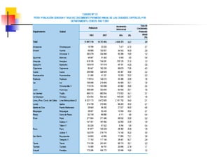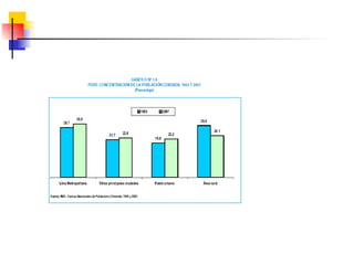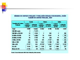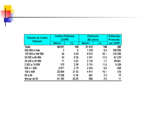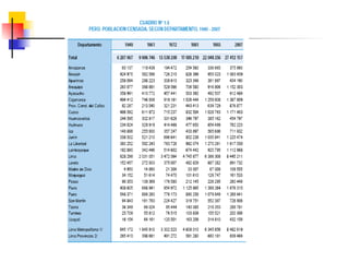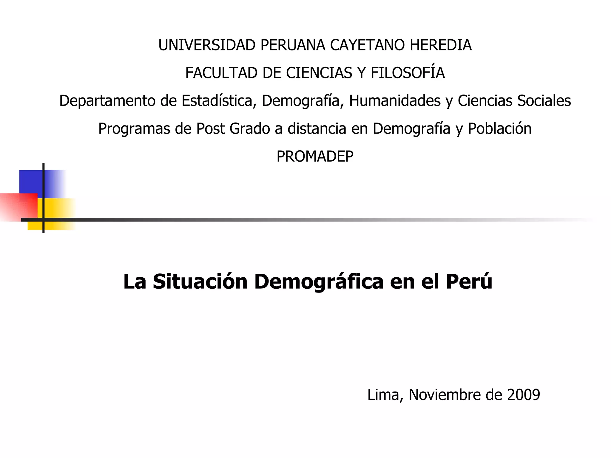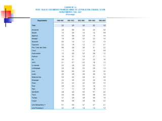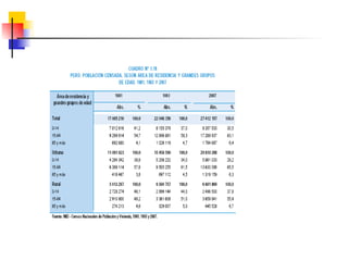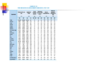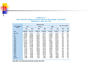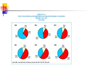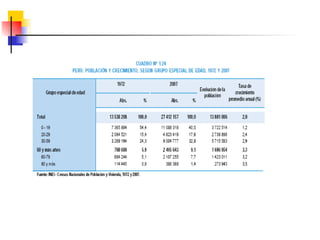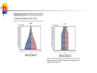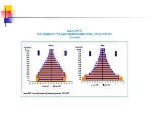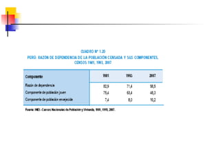 Este documento describe conceptos y medidas demográficas clave como tasas de natalidad, mortalidad y crecimiento natural. Explica cómo se calculan y provee ejemplos para el Perú. También resume la composición y dinámica de la población peruana, incluyendo su tamaño, distribución por edad, sexo y área, así como la ecuación de compensación para calcular cambios en la población.
