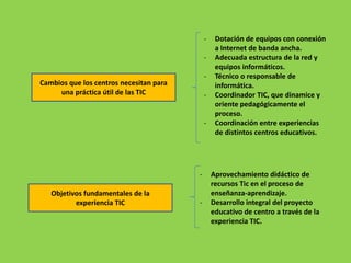 Las TIC deben estar incluidas en la educación porque crean una nueva sociedad a la que el sistema educativo debe servir y emplean los medios utilizados en la comunicación social. Los centros necesitan dotación de equipos con conexión a Internet de banda ancha, adecuada estructura de red, técnico informático y coordinador TIC para aprovechar los recursos TIC en el proceso de enseñanza-aprendizaje y desarrollar el proyecto educativo. El rol del profesor cambia a ser orientador y facilitador mientras el al