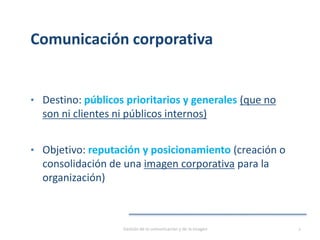 El documento presenta diferentes herramientas y estrategias de comunicación corporativa, como el lobby, la comunicación de crisis, las relaciones con los medios de comunicación y el patrocinio. Describe el lobby como un arte de comunicar para representar intereses legítimos de un grupo, utilizando tanto el lobby directo como indirecto. También explica los think tanks como instituciones que ofrecen consejos e ideas sobre política, y la importancia de prevenir las crisis a través de la auditoría de riesgos y la preparación.