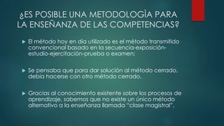 Este documento discute diferentes aspectos de enseñar y aprender competencias. Propone que no existe un único método para enseñar competencias de manera efectiva y en su lugar, se debe utilizar una variedad de estrategias y métodos según sea apropiado. También describe variables clave como las relaciones entre docentes y estudiantes, la organización del espacio y tiempo, y los materiales de aprendizaje que configuran la práctica educativa efectiva para el desarrollo de competencias.