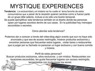 Este documento presenta varias tendencias de consumo actuales, incluyendo una orientada a la exclusividad y el misterio, otra relacionada con el uso de colores neón y estilos llamativos, y una más enfocada en experiencias multisensoriales que estimulan los sentidos.