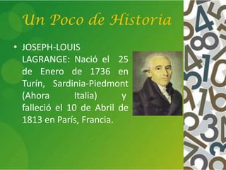 El documento presenta información sobre el teorema de Lagrange en teoría de grupos. Explica que Lagrange estudió un caso particular del teorema cuando G es el grupo de permutaciones. Luego define relaciones de equivalencia y clases de equivalencia. Finalmente, enuncia y demuestra el teorema de Lagrange, el cual establece que el orden de un subgrupo H de un grupo finito G divide al orden de G.