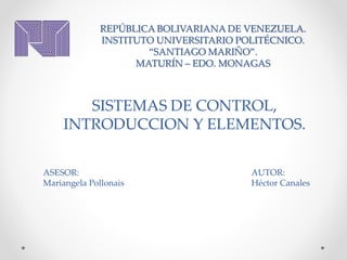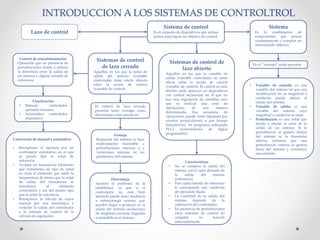 Este documento introduce los conceptos básicos de los sistemas de control, incluyendo sus elementos clave como variables de entrada y salida, perturbaciones, control de lazo abierto vs cerrado, y clasificaciones de sistemas de control. También describe los componentes fundamentales de un sistema de control automatizado de lazo cerrado como el regulador, comparador, accionador, transductor y captador. Finalmente, cubre brevemente diferentes tipos de transductores.