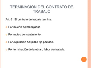 Este documento resume los principales modos de terminación de contratos laborales y las causas justificadas (justa causa) según la legislación colombiana. Describe las formas en que un contrato puede finalizar, ya sea por acuerdo mutuo, vencimiento de plazo, conclusión de la tarea contratada, quiebra de la empresa, o despido. También explica las causales que permiten a empleadores y empleados dar por terminado el contrato de manera unilateral, así como los pagos de indemnización correspondientes.