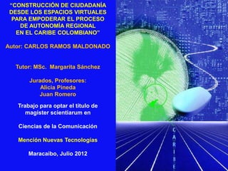 Este documento trata sobre el uso de los espacios virtuales para construir ciudadanía y promover el proceso de autonomía regional en el Caribe colombiano. El autor analizará cómo orientar la usabilidad de sitios web como el portal regioncaribe.org hacia este fin. El objetivo general es analizar la usabilidad de los espacios virtuales como mediadores para construir ciudadanía y apoyar la autonomía regional en la región Caribe. Los objetivos específicos son caracterizar el portal regioncaribe.org e identificar otros sitios de apoyo, y describir las e
