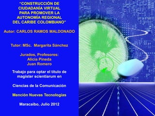 Este documento propone construir una ciudadanía virtual para promover la autonomía regional del Caribe colombiano a través de tres oraciones. Primero, argumenta que Internet ha creado nuevos conceptos de espacio público e identidad cultural más allá de fronteras tradicionales. Segundo, sugiere que el uso de plataformas digitales puede formar una conciencia colectiva entre los habitantes de la región Caribe para procurar mayor descentralización administrativa. Tercero, justifica que los portales ciudadanos de Internet ofrecen una oportunidad para construir op