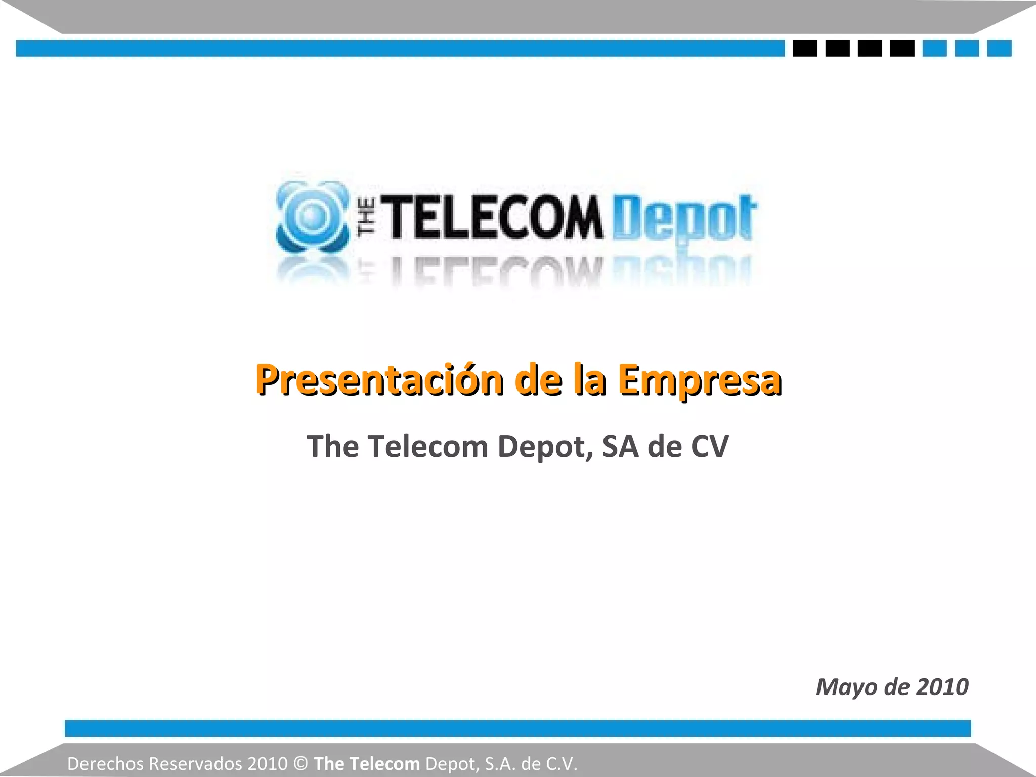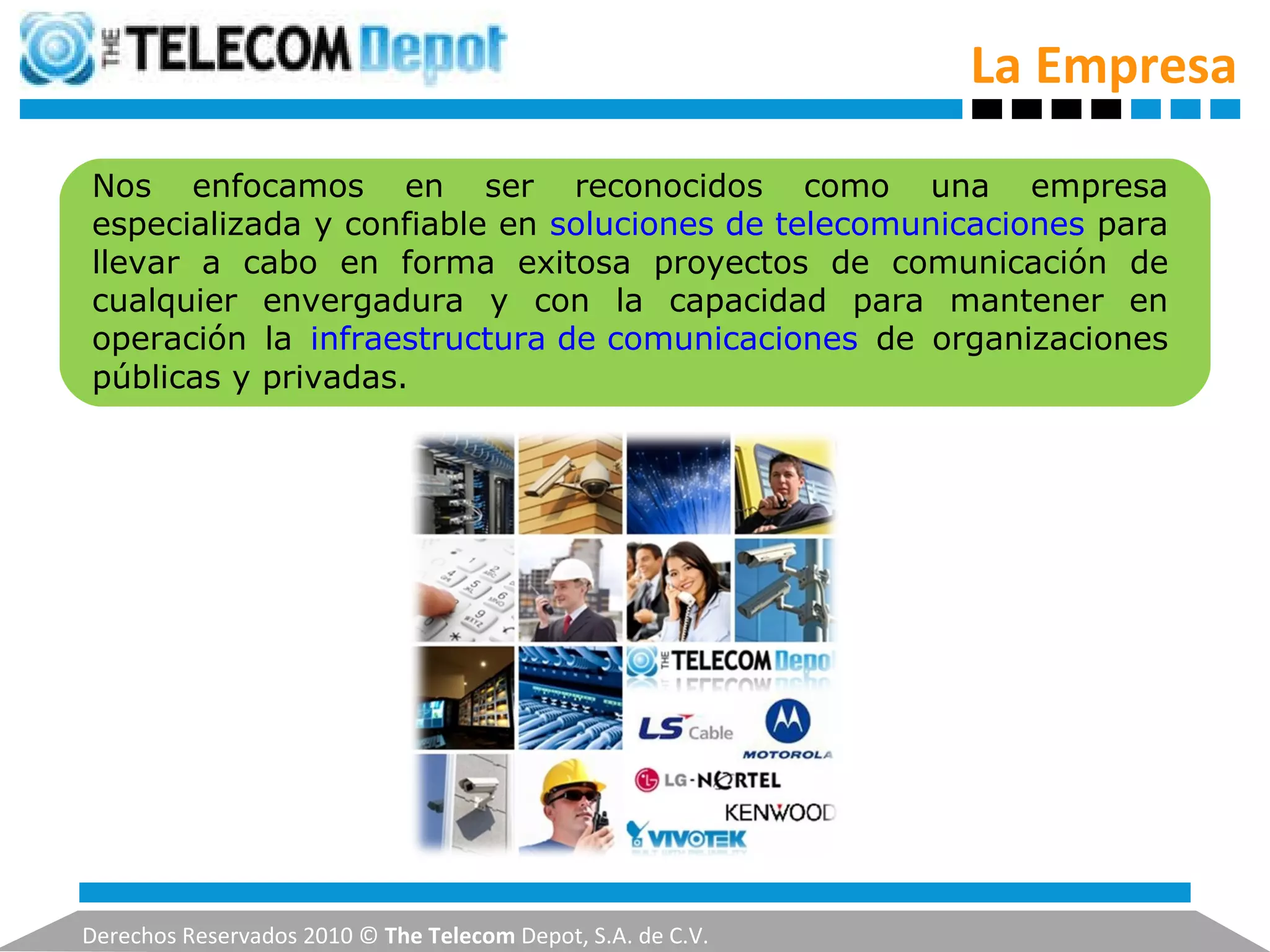 The Telecom Depot es una empresa mexicana especializada en soluciones de telecomunicaciones. Se fundó en 2008 y ofrece servicios como diseño e instalación de sistemas de telefonía, redes, cableado estructurado, CCTV y seguridad. Su misión es integrar soluciones de telecomunicaciones para satisfacer las necesidades de comunicación de pequeñas y medianas empresas. Entre sus principales proveedores se encuentran LG-Nortel, VivoTek y Motorola.