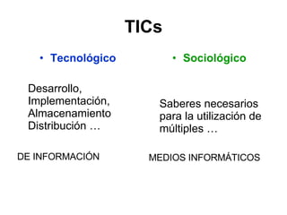 El documento habla brevemente sobre las tecnologías de la información y la comunicación (TIC), incluyendo servicios, redes, artefactos, software e información interconectada para mejorar la calidad de vida. También menciona el desarrollo, implementación, almacenamiento y distribución tecnológica de información, así como los saberes sociológicos necesarios para utilizar múltiples medios informáticos como la Web 2.0 y el aprendizaje electrónico (e-learning).