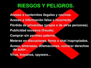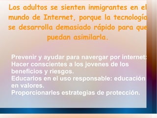 Internet ha supuesto una revolución en la vida moderna al depender cada vez más aspectos como el trabajo, ocio, comunicación y aprendizaje de su uso. Se ha consolidado el papel del ciudadano como protagonista que genera contenido en lugar de solo consumirlo. Aunque internet tiene ventajas como la expresión y acceso a información, también conlleva riesgos como acceder a contenidos ilegales, pérdida de privacidad y virus. Por ello, es importante educar a los hijos sobre un uso responsable que maximice las oportunidades y minimice los peligros