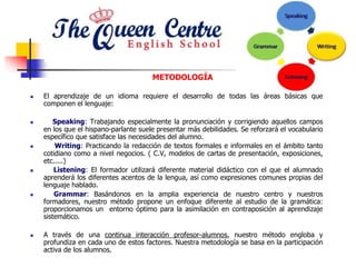 El documento presenta The Queen Centre, una escuela de idiomas que ofrece programas de formación lingüística de calidad para empresas. La escuela utiliza una metodología participativa que desarrolla las cuatro habilidades básicas del lenguaje - habla, escritura, comprensión auditiva y gramática - a través de interacción continua entre profesores y alumnos. Asimismo, diseña planes de formación personalizados según los objetivos y necesidades específicas de cada empresa cliente.
