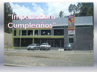 La empresa Importadora Cumpleaños se dedica a la importación, distribución y comercialización de productos para fiestas infantiles y ocasiones especiales. Fue fundada en 1992 y actualmente cuenta con tres locales en Quito. La empresa opera con capital propio y créditos bancarios. Atiende principalmente a clientes de clase media y alta, tanto minoristas como mayoristas. Entre sus fortalezas se encuentran la calidad de sus productos y su atención al cliente.