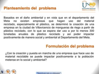 Este documento presenta un proyecto para crear una fábrica de mangueras de riego utilizando plástico reciclado en Villavicencio, Meta. El proyecto busca dar uso a 300 toneladas anuales de plástico reciclado e impactar positivamente la región. Se realizaron estudios de mercado, técnicos y financieros que demuestran la viabilidad del proyecto. La fábrica generaría empleos y vendería mangueras a precios más bajos que la competencia debido al uso de materias pri