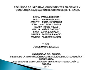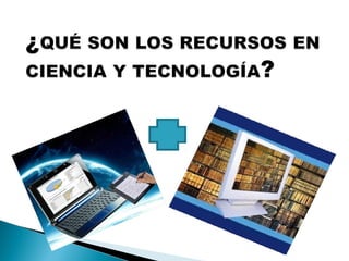 El documento aborda los recursos de información en ciencia y tecnología, enfatizando su evaluación y la importancia del servicio de referencia en bibliotecas. Se presentan objetivos específicos para una exposición sobre estos recursos, así como su clasificación y análisis. Se destaca la necesidad de contar con información actualizada y pertinente para mejorar la experiencia de investigación de los usuarios.