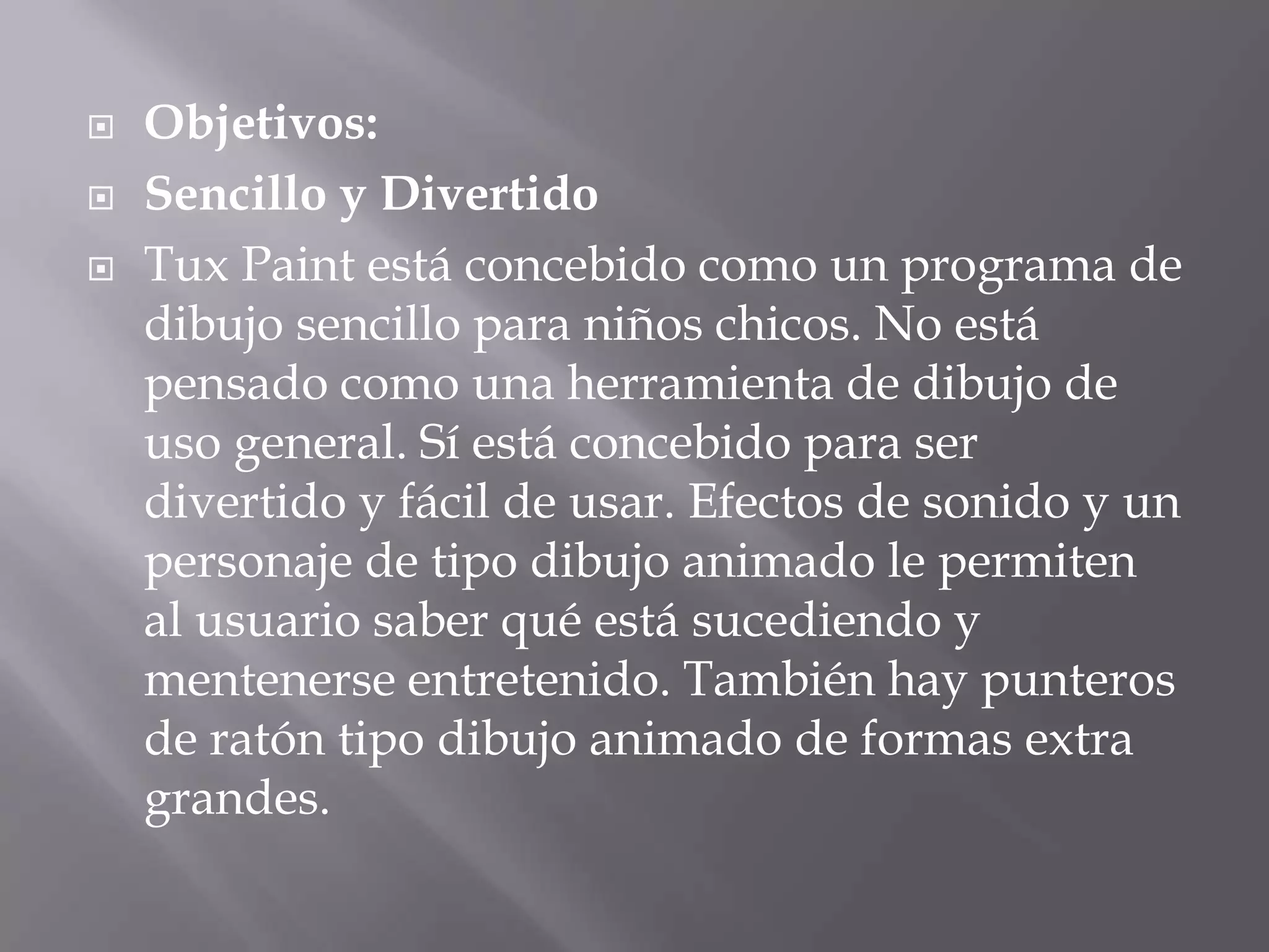 Tux Paint es un programa de dibujo gratuito diseñado para niños pequeños que presenta una interfaz simple y divertidos efectos de sonido. El programa ofrece una variedad de herramientas de dibujo para estimular la creatividad de los niños y cuenta con una mascota animada que guía al usuario.