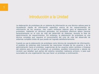 Este documento habla sobre la elaboración de prototipos como una técnica para la recopilación rápida de información de los requerimientos de los usuarios. Explica que hay cuatro enfoques básicos para la elaboración de prototipos y que estos deben hacerse temprano en el ciclo de desarrollo, durante la determinación de requerimientos. También indica que cuando se usa un prototipo, el analista busca las reacciones y sugerencias de los usuarios para mejorar el sistema que se está desarrollando.