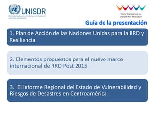 Este documento resume un taller sobre la gestión de riesgos asociados a los recursos hídricos que tuvo lugar en Tegucigalpa, Honduras en febrero de 2015. Incluye información sobre el Plan de Acción de las Naciones Unidas para la Reducción del Riesgo de Desastres, elementos propuestos para un nuevo marco internacional post-2015, y el Informe Regional sobre Vulnerabilidad y Riesgos de Desastres en Centroamérica.