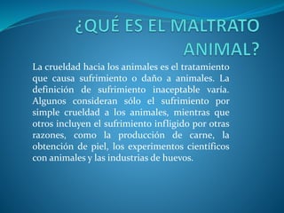 El documento habla sobre el maltrato animal. Define el maltrato animal como el trato que causa sufrimiento o daño a los animales. Señala que muchas personas consideran el maltrato animal como un asunto de gran importancia moral. También menciona que los derechos de los animales tratan de ayudar a disminuir el número de animales que son tratados cruelmente. Finalmente, sugiere crear conciencia en las personas para prevenir el maltrato, señalando que los padres juegan un papel importante.