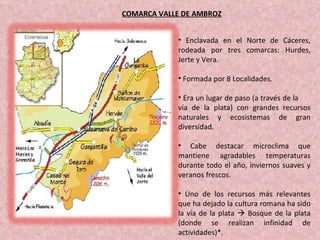 La comarca del Valle de Ambroz se encuentra en el norte de Cáceres, formada por 8 localidades. Tiene un clima agradable y gran diversidad ecológica. Es atravesada por la antigua Vía de la Plata romana, que ahora es una importante ruta turística y cultural. Algunos de los principales recursos turísticos son los balnearios de Baños de Montemayor, el casco antiguo y el barrio judío de Hervás, y los restos arqueológicos romanos en Cáparra.
