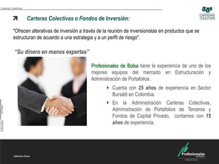 Carteras Colectivas Carteras Colectivas o Fondos de Inversión: "Ofrecen alterativas de inversión a través de la reunión de inversionistas en productos que se estructuran de acuerdo a una estrategia y a un perfil de riesgo". “Su dinero en manos expertas” Profesionales de Bolsa tiene la experiencia de uno de los mejores equipos del mercado en Estructuración y Administración de Portafolios. Cuenta con 25 años de experiencia en Sector Bursátil en Colombia. En la Administración Carteras Colectivas, Administración de Portafolios de Terceros y Fondos de Capital Privado, contamos con 15 años de experiencia.
