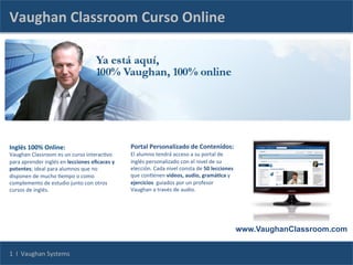 Vaughan Classroom ofrece un curso de inglés 100% online, diseñado para adaptarse a las necesidades de los alumnos mediante un enfoque interactivo que prioriza la conversación y la práctica verbal. Las lecciones estructuradas requieren una dedicación de al menos 20 minutos diarios y están acompañadas de materiales multimedia para mejorar la comprensión y pronunciación. Además, se ofrece una opción corporativa para empresas, que incluye seguimiento del progreso y tutorías personalizadas.