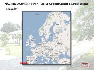 Este documento describe una casa magnífica en venta en la urbanización La Celada en Carmona, Sevilla. La casa tiene 312 metros cuadrados construidos, con 4 dormitorios, 3 baños y una terraza con vistas panorámicas. Se encuentra en una zona tranquila con todos los servicios y cerca de Sevilla, el aeropuerto y autopistas. El documento proporciona detalles sobre la distribución interior y características de la vivienda.