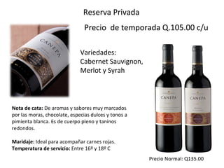 El documento describe una selección de vinos ideales para las celebraciones de fin de año, incluyendo opciones como cabernet sauvignon, merlot y chardonnay, con notas de cata y maridajes recomendados. Se mencionan precios de temporada y precios normales, destacando la calidad y la asequibilidad de los vinos chilenos. Cada vino ofrece características únicas que los hacen adecuados para diferentes tipos de comidas y ocasiones.