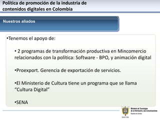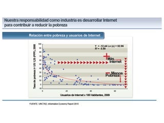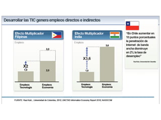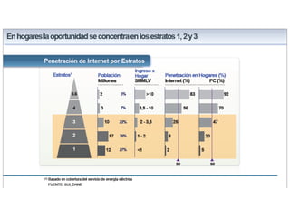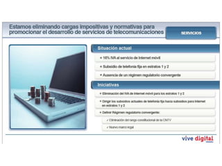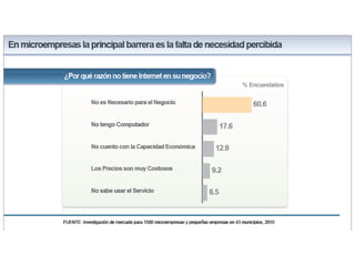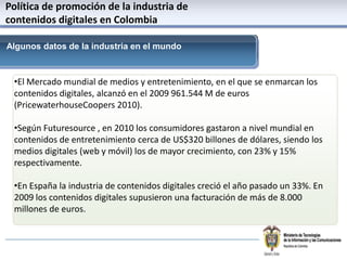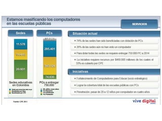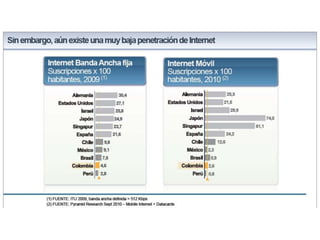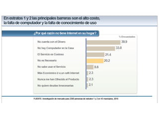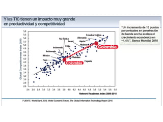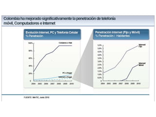 El resumen analiza el boletín trimestral de las TIC del tercer trimestre de 2010 en Colombia. Señala que Colombia alcanzó un total de 4.046.997 suscriptores de acceso a Internet fijo y móvil, con un crecimiento anual del 12.83%. El crecimiento anual de Internet móvil fue del 31% y de Internet fijo fue del 4.3%. El índice de penetración de servicios de Internet alcanzó el 8.9%. Adicionalmente, Colombia alcanzó 43.405.330 abonados de telefonía móvil,
