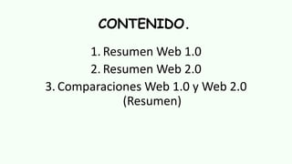 El documento compara la Web 1.0 y la Web 2.0, describiendo que la Web 1.0 era de solo lectura con contenido estático, mientras que la Web 2.0 permite la interacción y colaboración de los usuarios para generar contenido dinámico a través de comunidades, blogs y wikis.