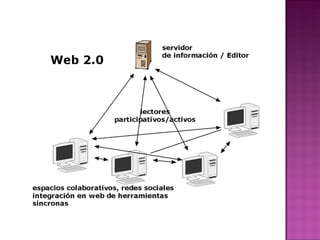 La Web 2.0 es una evolución de la Web tradicional hacia aplicaciones enfocadas en los usuarios finales que generan colaboración y comparten información. Algunas características clave son que los usuarios generan contenido a través de blogs, wikis y otros medios y que la información fluye bidireccionalmente entre usuarios. La Web 2.0 promueve una interacción social entre usuarios que comparten y modifican contenido de manera colaborativa.