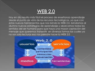 La Web 2.0 permite nuevas estrategias de aprendizaje más dinámicas e interactivas entre estudiantes y docentes, que involucran diferentes sentidos y formas de transmitir información más allá de la lectura. Algunas herramientas clave de la Web 2.0 son los blogs para comunicación sin conocimientos técnicos, wikis para colaboración, Flickr para compartir y comentar imágenes, SlideShare para compartir presentaciones, y podcasts para distribuir archivos de audio.