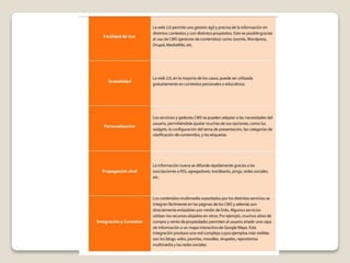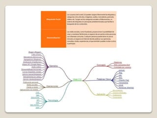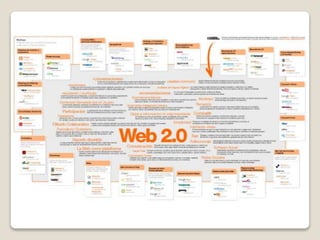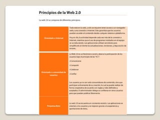 El documento describe la evolución de Internet desde la Web 1.0 estática a la Web 2.0 dinámica y participativa. La Web 2.0 permite a los usuarios crear y compartir contenido a través de blogs, wikis, redes sociales y otros medios. Gracias a esto, la información se actualiza constantemente y se aprovecha la "inteligencia colectiva" de los usuarios.