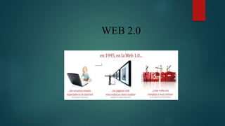 El documento habla sobre la Web 2.0, que es la segunda generación de la Web basada en comunidades de usuarios. Se pasa de una web informativa creada por expertos a una web social donde cualquiera puede participar fácilmente. Algunas características clave de la Web 2.0 son que los usuarios se transforman en creadores de contenido a través de plataformas colaborativas que permiten publicar sin conocimientos técnicos y facilitan la interacción a través de información en constante cambio y software gratuito o de bajo