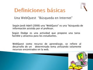 Este documento define una WebQuest como una actividad de búsqueda de información guiada por el profesor que propone una tarea atractiva para los estudiantes utilizando recursos de Internet. Una WebQuest consta de seis pasos clave: introducción, tarea, recursos, proceso, evaluación y conclusión. Su objetivo es que los estudiantes trabajen en grupo para explorar temas abiertos y problemas con múltiples soluciones posibles, mientras desarrollan habilidades como comparar, clasificar, inducir y analizar perspectivas.