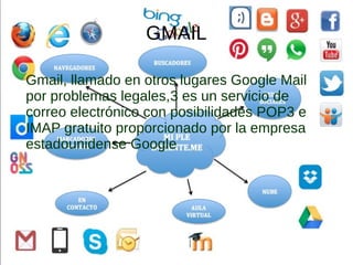 El documento resume brevemente los servicios de Gmail (correo electrónico gratuito de Google), avatares (imágenes que representan a un usuario), Blogger (servicio para crear bitácoras en línea), Dropbox (almacenamiento en la nube y sincronización de archivos), doodles de Google (alteraciones temporales del logotipo), Google Drive (servicio de almacenamiento de archivos en la nube), nubes de palabras (visualización de frecuencias de palabras) y Wikispaces (servicio de alojamiento web gratuito).