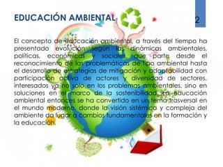 El documento describe una experiencia de educación ambiental llevada a cabo en una escuela rural en Colombia. Los estudiantes desarrollan proyectos de aula anuales enfocados en problemas ambientales de su territorio, fomentando habilidades investigativas, respeto por la naturaleza y apropiación del territorio. Aunque no está integrado en el plan educativo de la escuela, el enfoque participativo y basado en el contexto ha generado valores ambientales en la comunidad educativa.