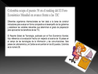 El documento habla sobre los avances de Colombia en el Índice Mundial de Desarrollo de las TIC. Señala que la infraestructura, acceso a Internet, telefonía móvil y conectividad han mejorado, lo que atrae inversión extranjera a sectores como outsourcing, desarrollo de software y turismo médico. También menciona que el Ministerio de TIC está trabajando en un satélite, Tercer Canal y asignación de espectro por US$300 millones. Finalmente, sugiere reforzar programas como Mi