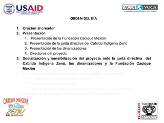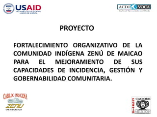 El documento detalla un proyecto de fortalecimiento organizativo para la comunidad indígena zenú en Maicao, La Guajira, con el objetivo de mejorar su capacidad de incidencia y gobernabilidad. Incluye presentaciones, socialización del proyecto y talleres para capacitar a los líderes y organizaciones indígenas, así como la caracterización del pueblo zenú. También se especifican acciones, indicadores de éxito y el presupuesto total del proyecto desde junio hasta noviembre de 2013.