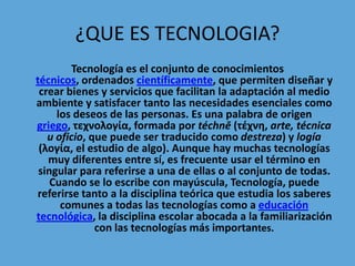 La tecnología es el conjunto de conocimientos técnicos ordenados científicamente que permiten diseñar y crear bienes y servicios para satisfacer las necesidades de las personas y facilitar su adaptación al medio ambiente. Existen diferentes tipos de tecnología como la fija, flexible, blanda, dura, de equipo, de operación, de producto y limpia, las cuales se diferencian por sus características particulares.