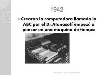 El documento resume los hitos más importantes en el desarrollo de la computadora desde 1942 hasta el presente. En 1942, el Dr. Atanasoff empezó a pensar en una máquina de tiempo. En 1946 se diseñó la primera computadora electrónica por parte de Jhon Mauchlely y Jhon Eckert. En 1951 comenzó la primera generación de computadoras con la presentación de la primera computadora digital comercialmente viable.