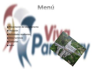 El departamento Central de Paraguay tiene como capital a Asunción. Algunos de los sitios turísticos más destacados son las antiguas estaciones de tren como Luque y Areguá, el Museo Mitológico Ramón Elías en Capiatá y El Cántaro Espacio Cultural en Areguá. También se encuentran Jesús de Tavarangüe, declarado Patrimonio Mundial, y Cielo Verde en Paraguari, que ofrece alojamiento y actividades al aire libre.
