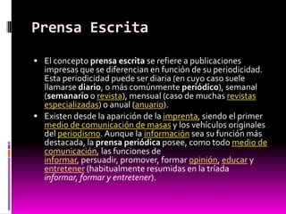 El documento proporciona una introducción a la prensa escrita, incluyendo su historia, tipos, formatos, distribución y venta. También discute la digitalización de la prensa y el futuro de los periódicos, señalando desafíos como la competencia de la televisión y Internet y la disminución de la audiencia en algunos países desarrollados.