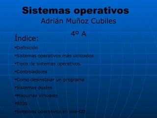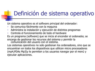 Este documento describe los conceptos básicos de los sistemas operativos, incluyendo su definición, los tipos más comunes, y cómo funcionan. Explica que un sistema operativo administra los recursos de hardware y permite la comunicación entre el usuario y la computadora. Luego describe los sistemas operativos más utilizados como Windows, Linux, Mac OS y UNIX. Finalmente, cubre temas como controladores de dispositivos, sistemas duales, virtualización y cómo algunos sistemas operativos pueden ejecutarse directamente desde un CD-ROM sin necesidad de
