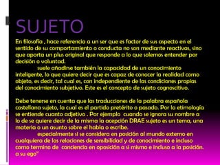 El documento habla sobre el sujeto en filosofía, que se refiere a un ser que es factor de sus propias acciones y decisiones, no solo reacciones. También menciona el concepto de sujeto cognoscitivo y su capacidad de conocer la realidad de manera inteligente e independiente de condiciones subjetivas. Explica que la palabra sujeto en español también se refiere a un tema o asunto.