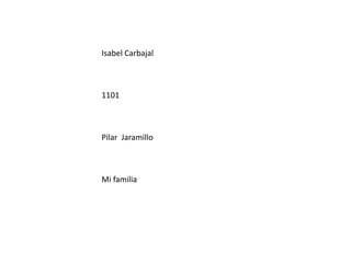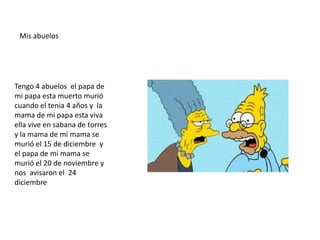 La autora habla sobre su familia, incluyendo sus abuelos, hermano y padres. Dos de sus abuelos han fallecido, mientras que sus otros dos abuelos siguen vivos. Ella describe a su hermano como una persona muy especial y atenta que siempre la ayuda cuando tiene problemas. Finalmente, dice que sus padres son maravillosos, la entienden y le dan consejos para que progrese en la vida.