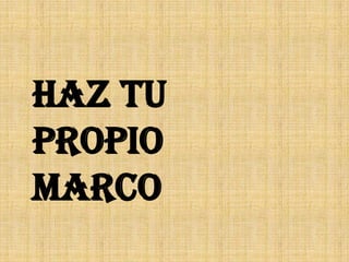 El documento proporciona instrucciones para crear un marco personalizado en una aplicación de diseño gráfico. Explica cómo abrir un nuevo documento vertical, agregar fotos, aplicar un fondo de gradiente, recortar imágenes, agregar capas, redimensionar imágenes, rotar elementos y agregar texto para crear un marco decorado de manera personal.