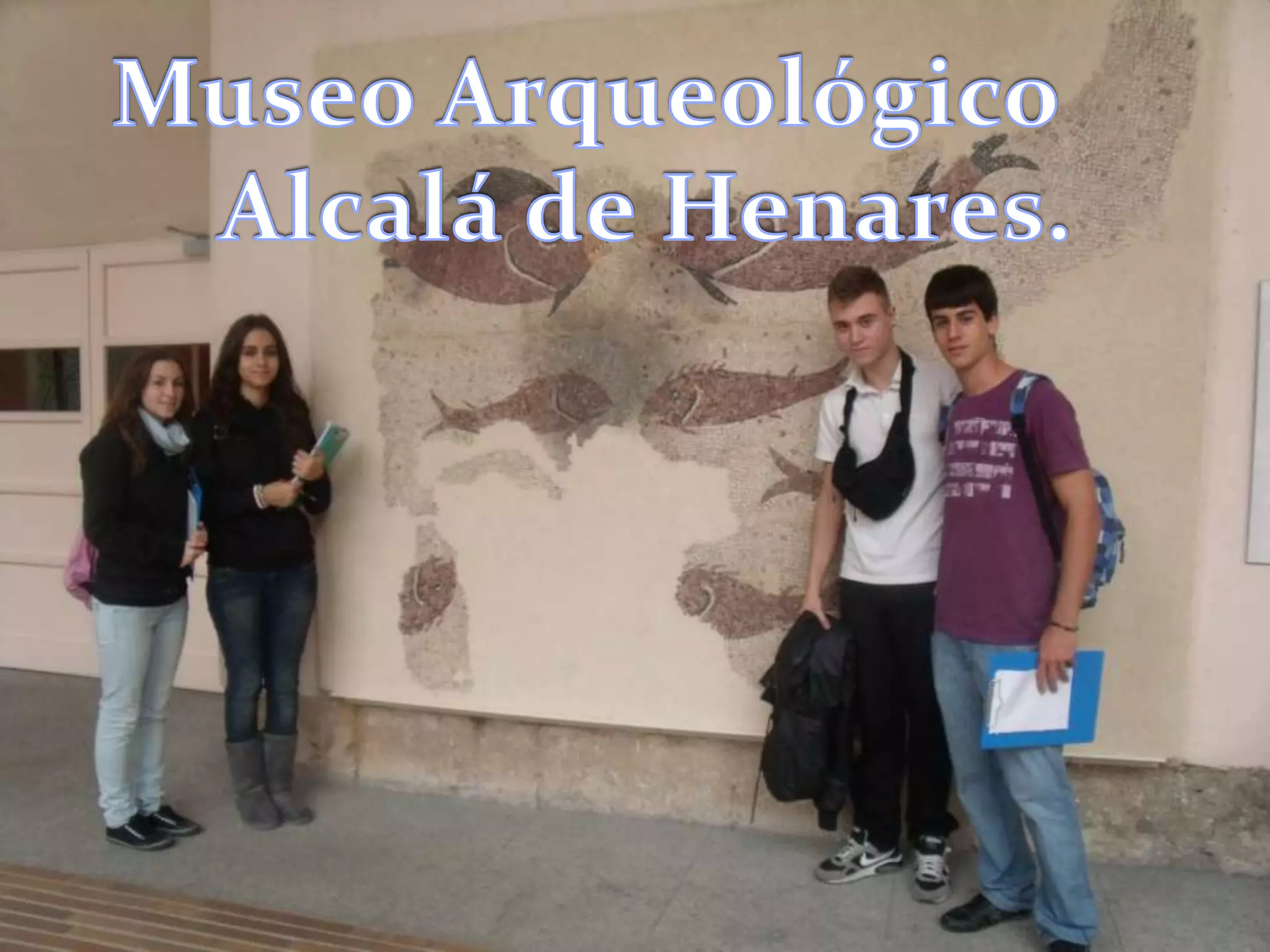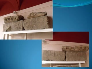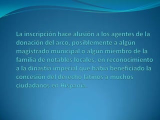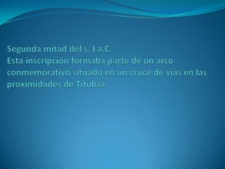 El documento describe tres mosaicos y aspectos de las vías romanas en Hispania. El primer mosaico representa el mito de Leda y Zeus, el segundo muestra delfines y peces, y el tercero se encuentra en el Museo Arqueológico Nacional. Las vías romanas conectaban ciudades y Madrid era un nudo de comunicaciones importante. Los romanos adoptaron el mosaico de los griegos y se extendió por el Imperio.