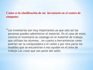 El inventario es la verificación periódica de los materiales, equipos e inmuebles de una entidad para comprobar el control administrativo, el manejo de los materiales y el aprovechamiento del espacio. En los centros de computo, el inventario clasifica el material de trabajo de los alumnos como computadoras y cañones, y los muebles como sillas y mesas que se encuentran en el área de trabajo. No llevar un control del inventario puede resultar en la pérdida u olvido de objetos y materiales.